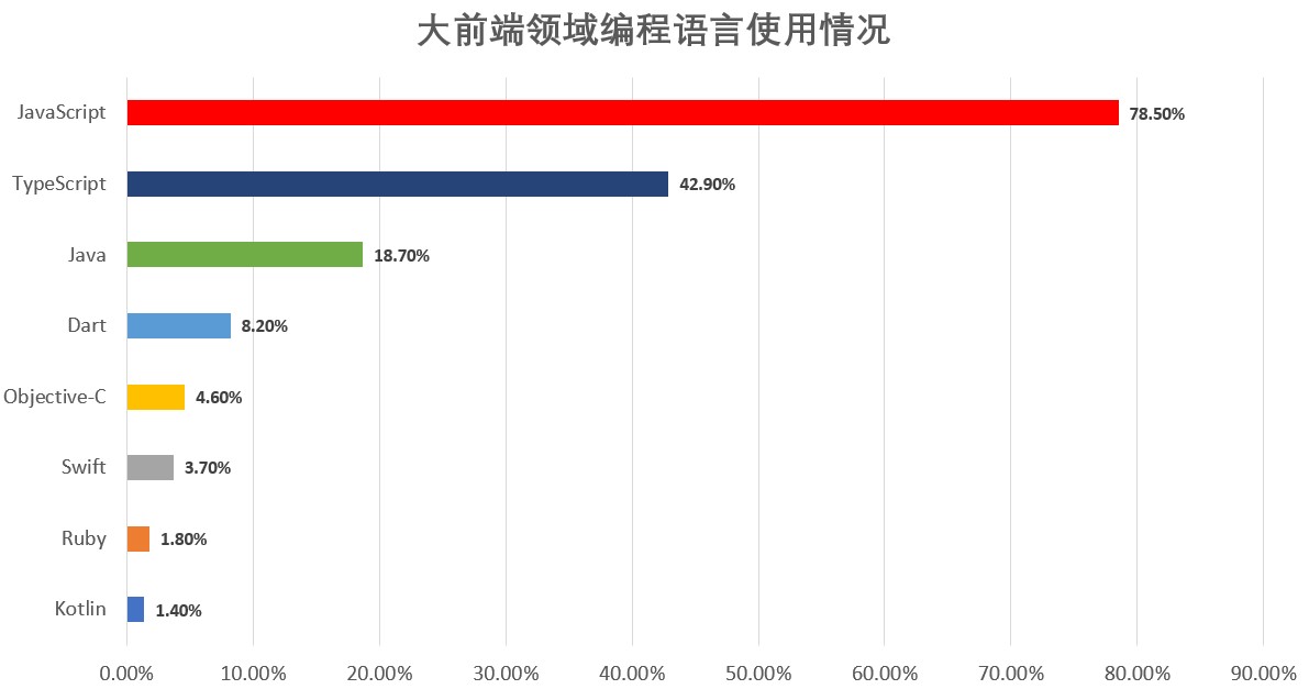 考虑到这两门编程语言都属于 JavaScript 生态,JavaScript 在大前端堪称“独霸天下”。前端程序员英楠在采访中称,使用最多的编程语言还是 JavaScript,因为工作主要还是面向 B 端,几乎全部项目都是用 JavaScript,公共组件则是用 TypeScript 开发。