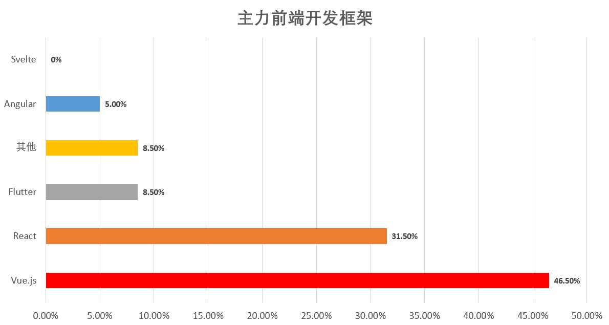基于投票数据,我们发现 Vue.js 以 46.5% 的得票率排名第一,被视为最流行的前端开发框架。而 React 紧随其后,以 31.5% 的得票率排名第二。Flutter 排名第三,得票率为 8.5%。