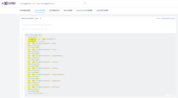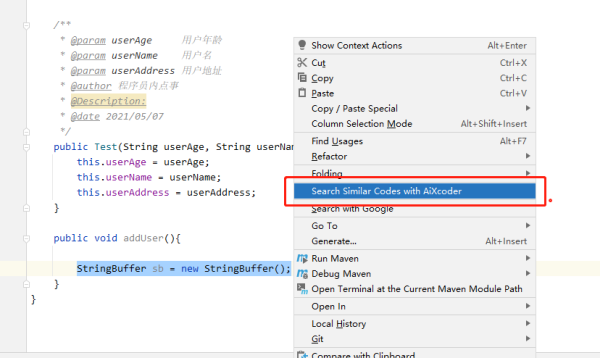 aiXcoder支持相似代码搜索功能,如果哪个API不会用,直接选中右键全网搜索实用案例。