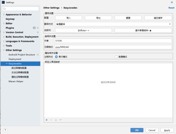 easy_javadoc一个可以快速为Java的类、方法、属性加注释的插件,还支持自定义注释样式,IDEA自身的Live Templates也支持,不过操作稍显繁琐,使用时效率不太高。