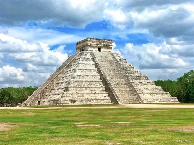 下图的照片显示了古代玛雅建筑:Chichen-Itza,九个巨大的石级堆垒而上,九十一级台阶(象征着四季的天数)夺路而出,塔顶的神殿耸入云天。所有的数字都如日历般严谨,风格雄浑。难以想象这是石器时代的建筑物。