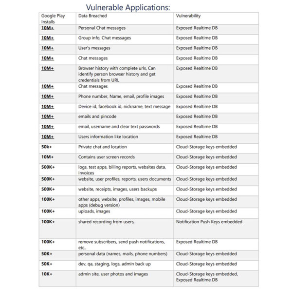 研究人员分析发现一共有23个APP存在云存储密钥嵌入和暴露实时数据库的配置错误问题,大多数APP下载量超过1000万,累计有超过1亿用户数据泄露,包括邮件地址、密码、隐私会话、设备位置、用户id等敏感信息。