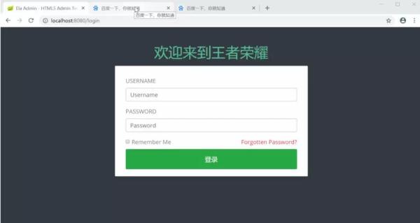 <!DOCTYPE html> <html xmlns:th="http://www.thymeleaf.org"> <head>     <meta charset="utf-8">     <meta http-equiv="X-UA-Compatible" content="IE=edge">     <title>Ela Admin - HTML5 Admin Template</title>     <meta name="description" content="Ela Admin - HTML5 Admin Template">     <meta name="viewport" content="width=device-width, initial-scale=1">      <link type="text/css" rel="stylesheet" th:href="@{/assets/css/normalize.css}">     <link type="text/css" rel="stylesheet" th:href="@{/assets/bootstrap-4.3.1-dist/css/bootstrap.min.css}">     <link type="text/css" rel="stylesheet" th:href="@{/assets/css/font-awesome.min.css}">     <link type="text/css" rel="stylesheet" th:href="@{/assets/css/style.css}">  </head> <body class="bg-dark">  <div class="sufee-login d-flex align-content-center flex-wrap">     <div class="container">         <div class="login-content">             <div class="login-logo">                 <h1 style="color: #57bf95;">欢迎来到王者荣耀</h1>             </div>             <div class="login-form">                 <form th:action="@{/login}" method="post">                     <div class="form-group">                         <label>Username</label>                         <input type="text" class="form-control" name="username" placeholder="Username">                     </div>                     <div class="form-group">                         <label>Password</label>                         <input type="password" class="form-control" name="password" placeholder="Password">                     </div>                     <div class="checkbox">                         <label>                             <input type="checkbox"> Remember Me                         </label>                         <label class="pull-right">                             <a href="#">Forgotten Password?</a>                         </label>                     </div>                     <button type="submit" class="btn btn-success btn-flat m-b-30 m-t-30" style="font-size: 18px;">登录</button>                 </form>             </div>         </div>     </div> </div>   <script type="text/javascript" th:src="@{/assets/js/jquery-2.1.4.min.js}"></script> <script type="text/javascript" th:src="@{/assets/bootstrap-4.3.1-dist/js/bootstrap.min.js}"></script> <script type="text/javascript" th:src="@{/assets/js/main.js}"></script>  </body> </html>