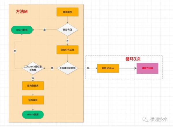为了便于理解,简单画了个流程图。这里面特别注意一个点,由于有一个并发时间差,所以会有一个二次 check 缓存是否有值的校验,防止缓存预热重复覆盖。