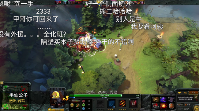 这是一个 Dota2 游戏直播的界面,我们可以看到,在游戏界面的上方有很多的弹幕,看直播的观众们就是在这里进行讨论的。