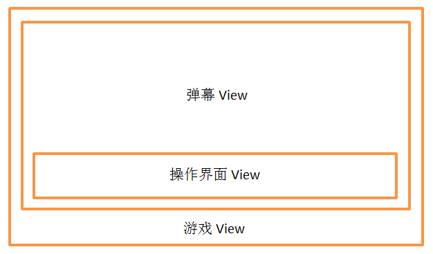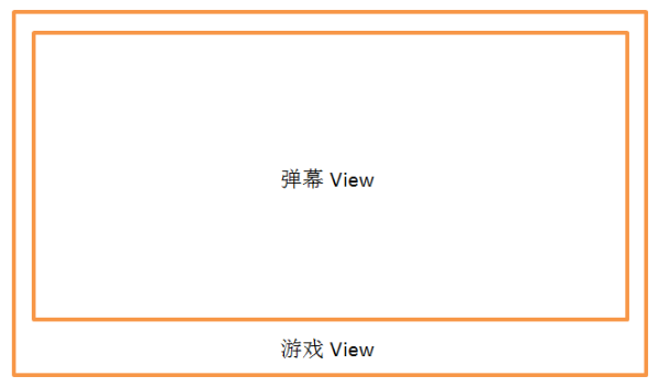 那么这样的一个界面该如何实现呢?其实并不复杂,我们只需要首先在布局中放置一个显示游戏界面的 View,然后在游戏界面的上方再覆盖一个显示弹幕的 View 就可以了。弹幕的 View 必须要做成完全透明的,这样即使覆盖在游戏界面的上方也不会影响到游戏的正常观看,只有当有人发弹幕消息时,再将消息绘制到弹幕的 View 上面就可以了。原理示意图如下所示: