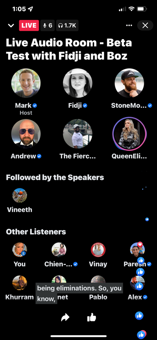 与扎克伯格一起出现在语音聊天室里的还有Facebook的副总裁兼Facebook现实实验室主管安德鲁·“博斯”·博斯沃思(Andrew “Boz” Bosworth)、Facebook应用主管福吉·斯莫(Fidji Simo)和三名Facebook游戏的创作者,包括StoneMountain64、StoneMountain64和TheFierceDivaQueen。