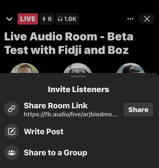 听众可以在语音直播的时候,点击屏幕底部的“竖起大拇指”按钮给内容“点赞”或以其他方式与内容互动。他们也可以选择在Facebook帖子或者小组中直接和朋友分享Audio Room,或通过其他应用分享Audio Room。