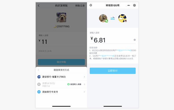 在手机QQ上转账同样也可以使用微信支付,这里需要先微信转入到余额,之后才能完成正常的支付。