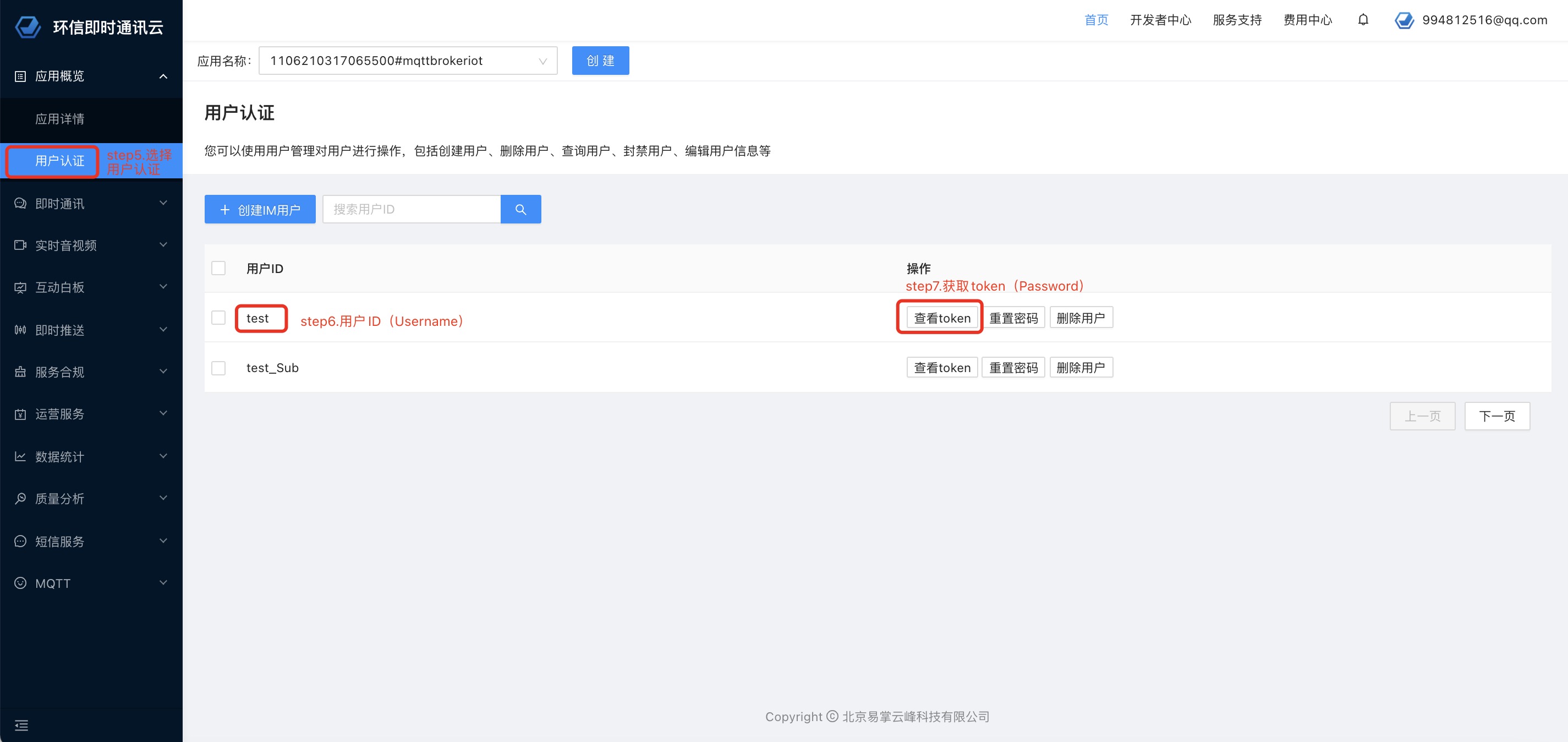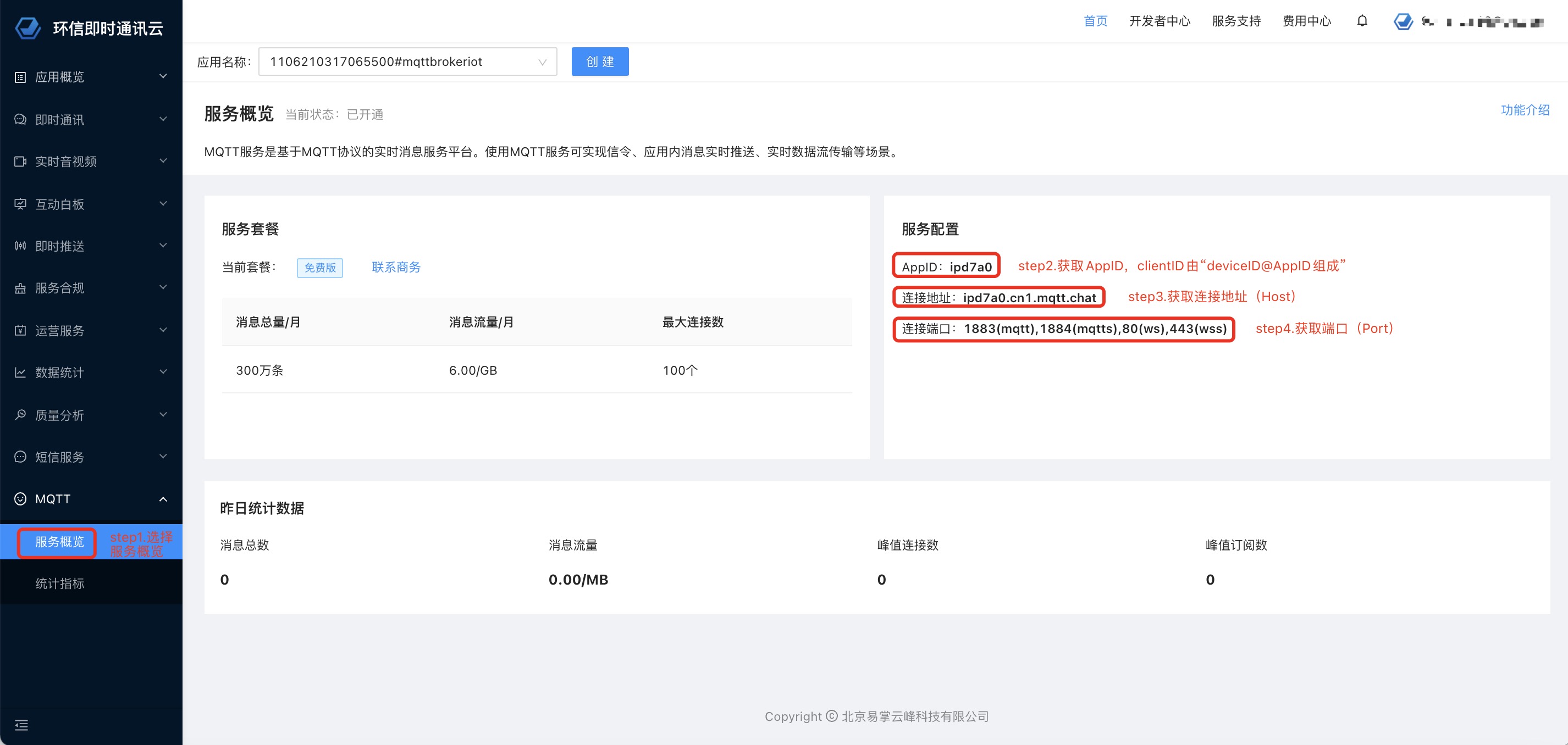 开通环信MQTT消息云服务见快速开通MQTT服务;