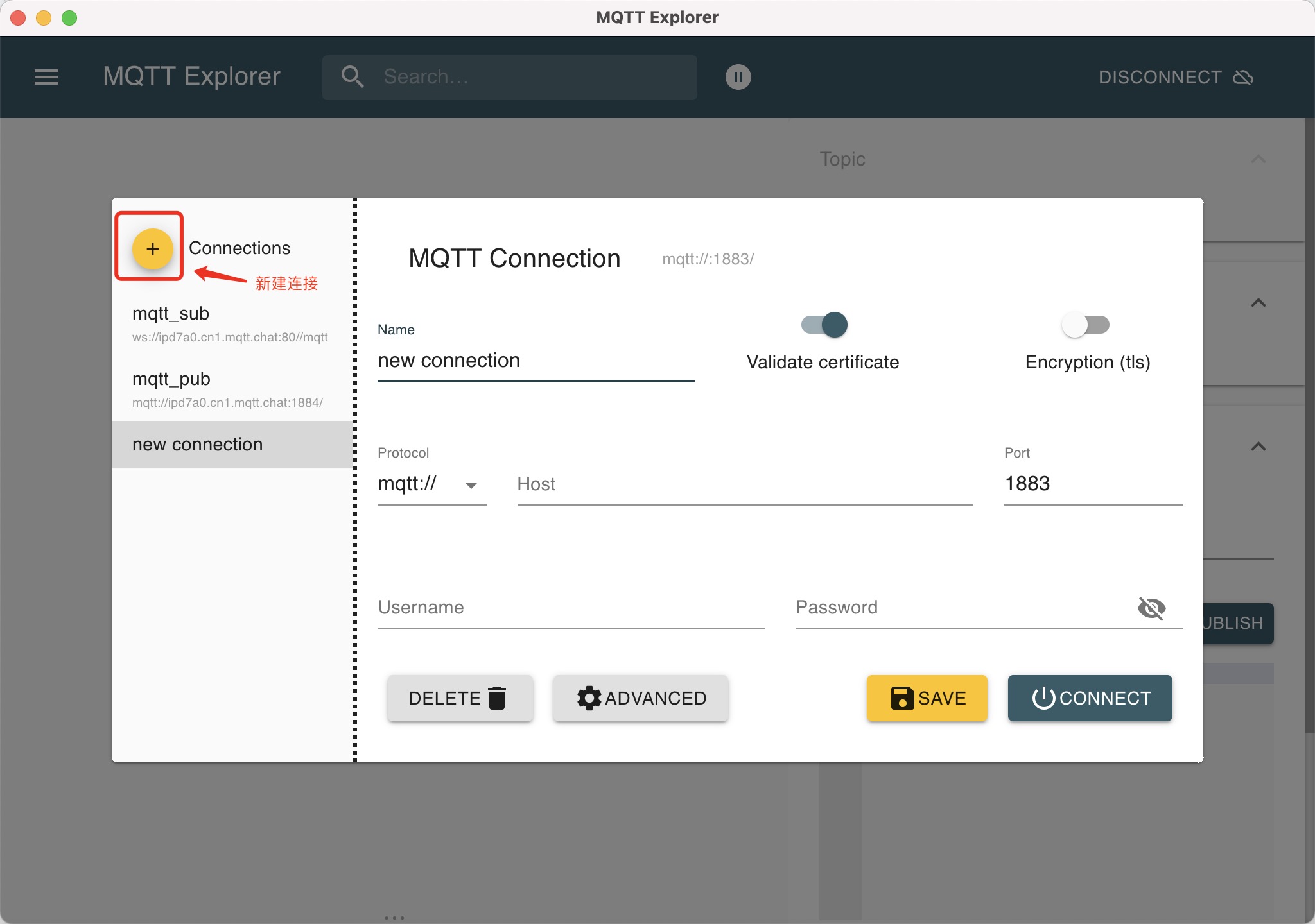 本文以MQTT Explorer for MAC版本为例(可通过APP Store下载)。打开MQTT客户端软件,选择“+”新建图标。