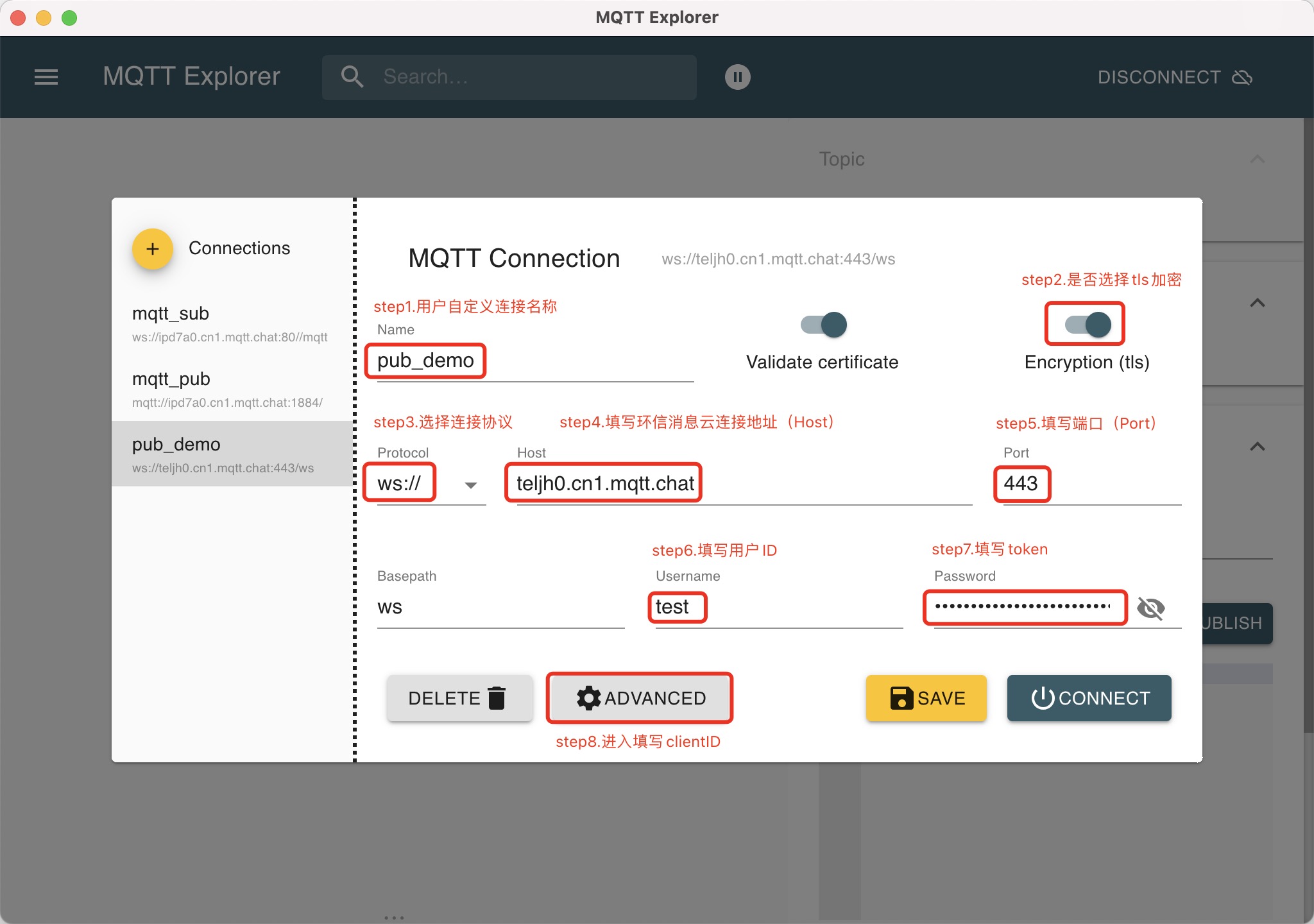step8.选择【ADVANCE】,填写clientID,clientID由两部分组成,“deviceID@AppID”;