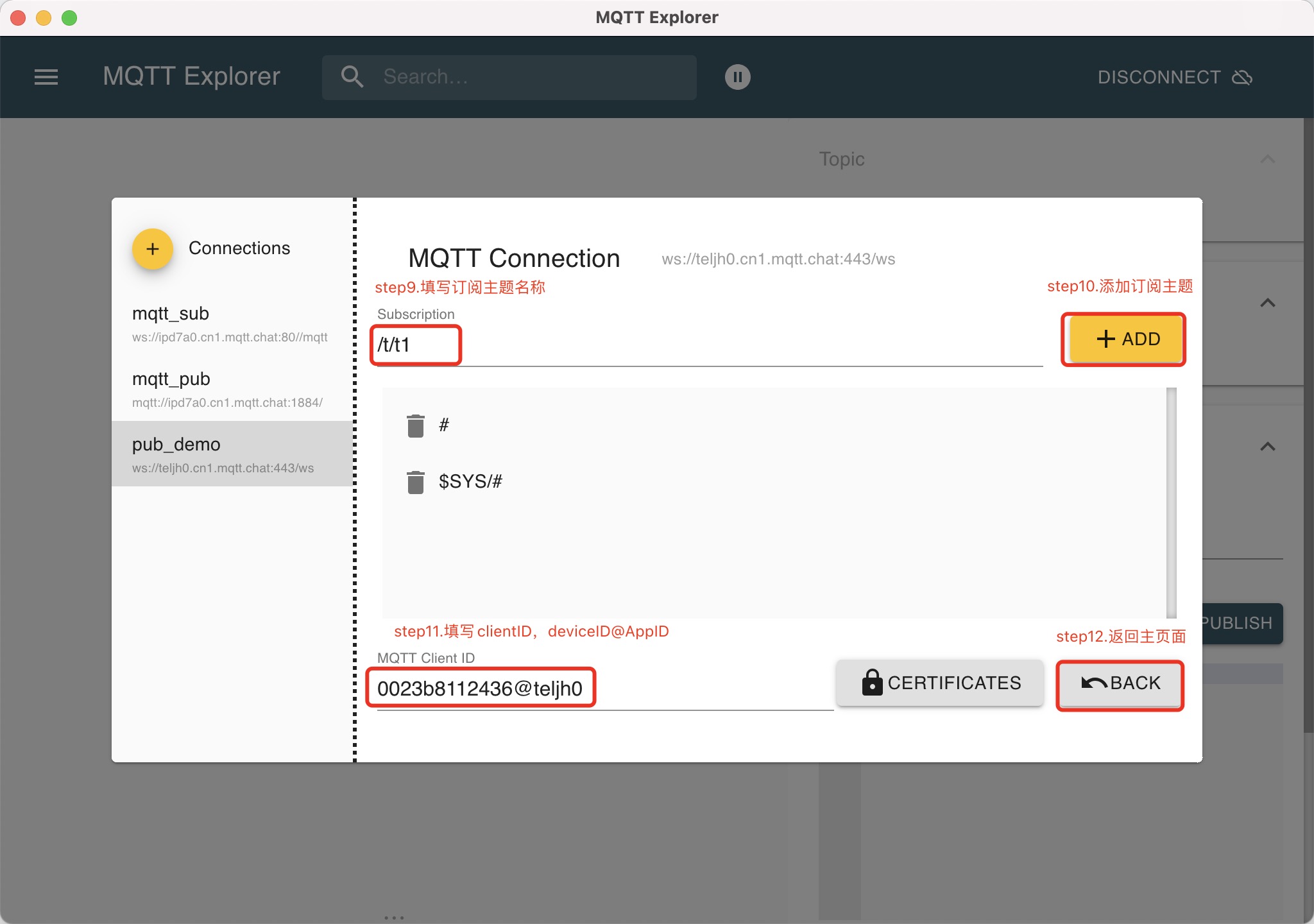 step9.填写订阅主题名称,此例为“t/t1” ;