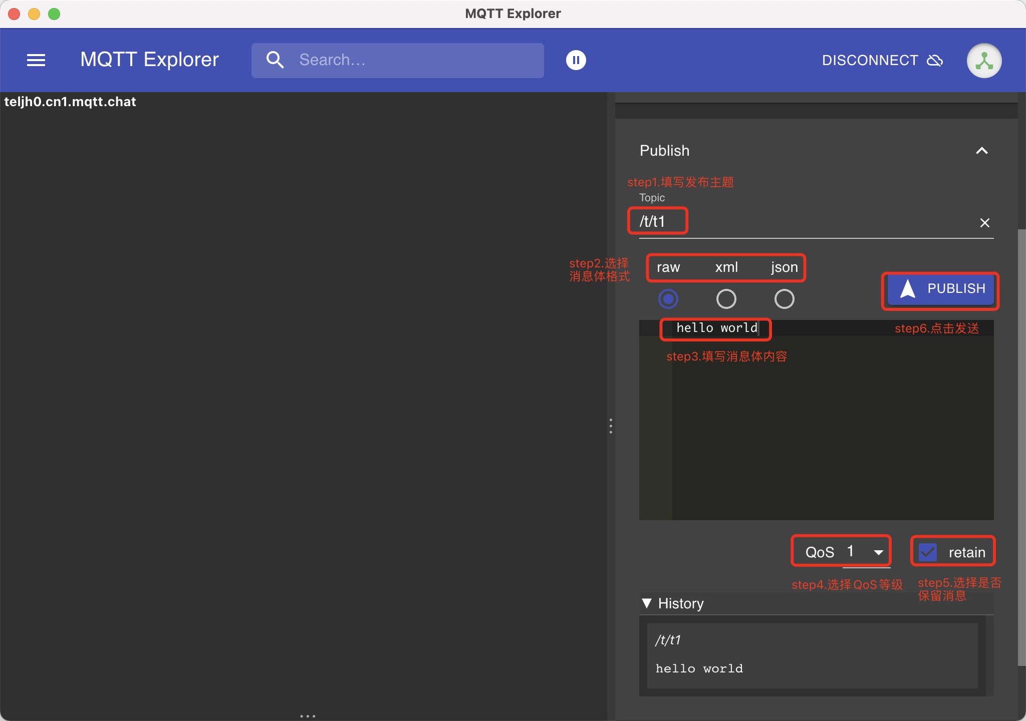 step5.选择是否为保留消息,取值:“0:不保留”、“1:保留,订阅客户端重新接入环信MQTT消息云时,可以接收保留消息”;