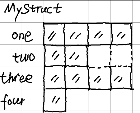 假设在我们的平台上,sizeof(int)=4, sizeof(short)=2, sizeof(bool)=1, 如果问你sizeof(MyStruct)=?,你可能会马上做个加法得到答案,但是答案不一定对。It depends! 假设我们是按照4个字节对齐,这上面的结构体在内存中实际排列如下图: