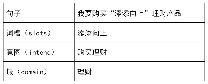 自然语言理解(NLU),将用户的输入映射到预先设置的场景语义槽中,让机器理解语言的意思,整个句子理解的流程按照如下表示,它展示了自然语言表示的示例,其中“添添向上”是指定为slots的值,并且为这句话指明了域和意图,按照域进行分类,明确之后接将进行知识类别匹配(图1)。