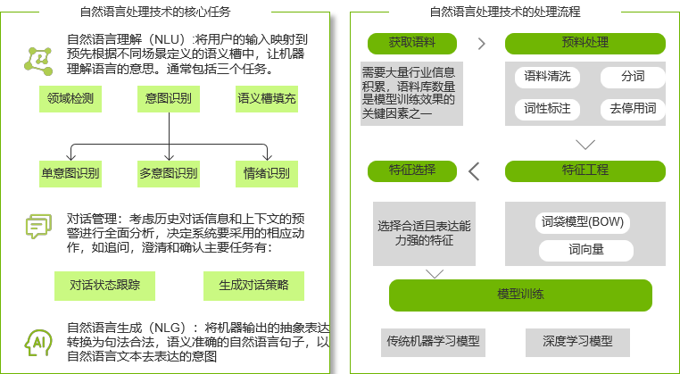 下面是自然语言处理的核心技术以及处理流程(图2),并结合了核心技术给出了对话的实例(图3)。