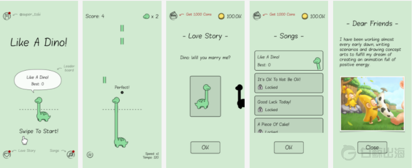 创始人 @super-toki 在应用故事和 YouTube 简介里写到:亲爱的朋友,你们好,写这封信是希望能够和所有喜欢 Like A Dino 的朋友分享我的故事,我享受每个夜晚到黎明的时光,因为在这个时间里我可以写剧本、画分镜直至我能创作一部属于自己的温暖又充满能量的动画。我计划在 YouTube 上分享我的动画,这可能需要 1 年、2 年,又或者是 10 年,我其实不太确定,但我知道我一定会完成。谢谢你们的喜欢,未来我会把每一个订阅我账户的你放在动画片尾。