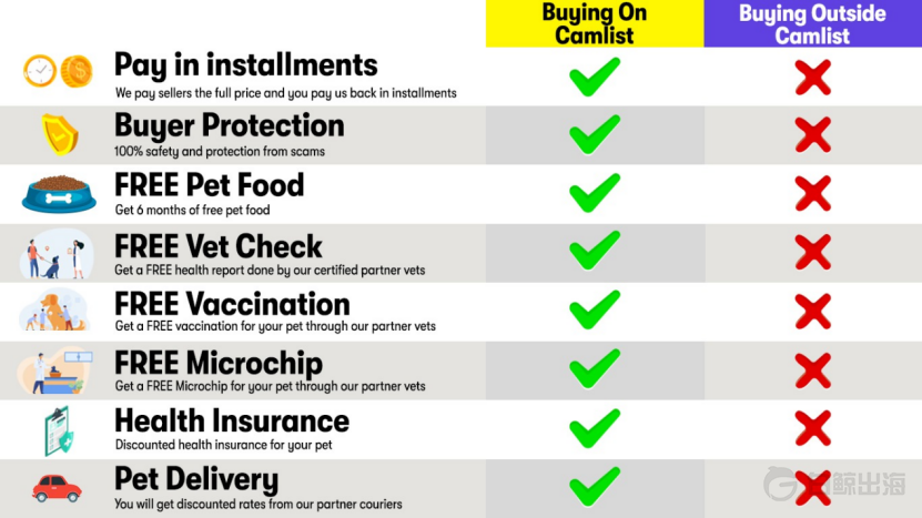 另外,Camlist 还为买家提供诸如 6 个月宠物粮、宠物健康体检、驱虫、宠物芯片一系列免费的服务。与此同时,还可以享受宠物保险折扣和物流折扣等额外的优惠。