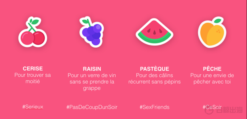 从功能和定位来看,Fruitz 和 Tinder 等 Dating App 并没有很大差别。但不同的是,Fruitz 借“水果符号”将不同用户使用产品的需求进行了具象化表达。目前Fruitz共选用了樱桃、葡萄、西瓜和桃子等4种水果来作为需求代表,樱桃代表正在认真寻找另一半、葡萄代表希望能够找到一起喝杯酒或者吃顿饭的朋友、西瓜代表在寻找性伴侣,而桃子则代表寻找一夜情。相较于赤裸地表达自己的需求,可爱的水果们似乎在一定程度上代表了成年人心照不宣的默契...