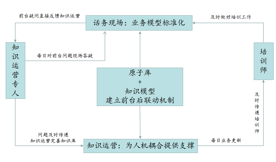 (二)打造了AI+人工前后台联动的知识管理体系。人机耦合进程中,知识库发挥着不可替代的作用。人机耦合通过“人”构建知识原子库及知识模型库,建立了以AI技术、前台、后台联动为基础的“机”自主应用知识管理流程体系,实现了业务模型标准化,知识点灵活配置,并对外提供统一标准的能力输出接口。目前,黑龙江联通话务现场和知识运营中心共同建立了前后台联动机制,设置了专门业务人员(采编)更新知识,并组织开展培训;知识运营中心每天设置专人对话务现场进行问题答疑,发现的问题第一时间修改完善知识库,确保知识的精准有效,实现了知识库的人机共享,AI+人工前后台联动的知识管理体系已相当完备。