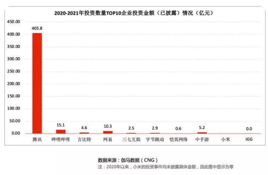 多家企业在有序领域的投资其实手笔都不小,2020-2021年,腾讯在游戏领域的投资超过400亿元,远超其他游戏企业。