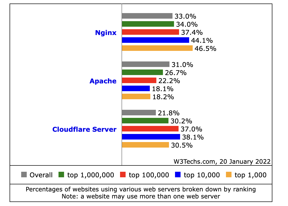 不少开发者对 Igor 所做出的贡献表达了崇敬和感谢,也有网友感慨“巅峰一代落幕”。从 2002 年发展至今日,Nginx 已经成为全球最受欢迎的 Web 服务器。据 W3Techs 统计,截至 2022 年 1 月上旬,Nginx 占据了全球 Web 服务器市场 33% 的份额。排在第二位的是 Apache,份额为 31%。