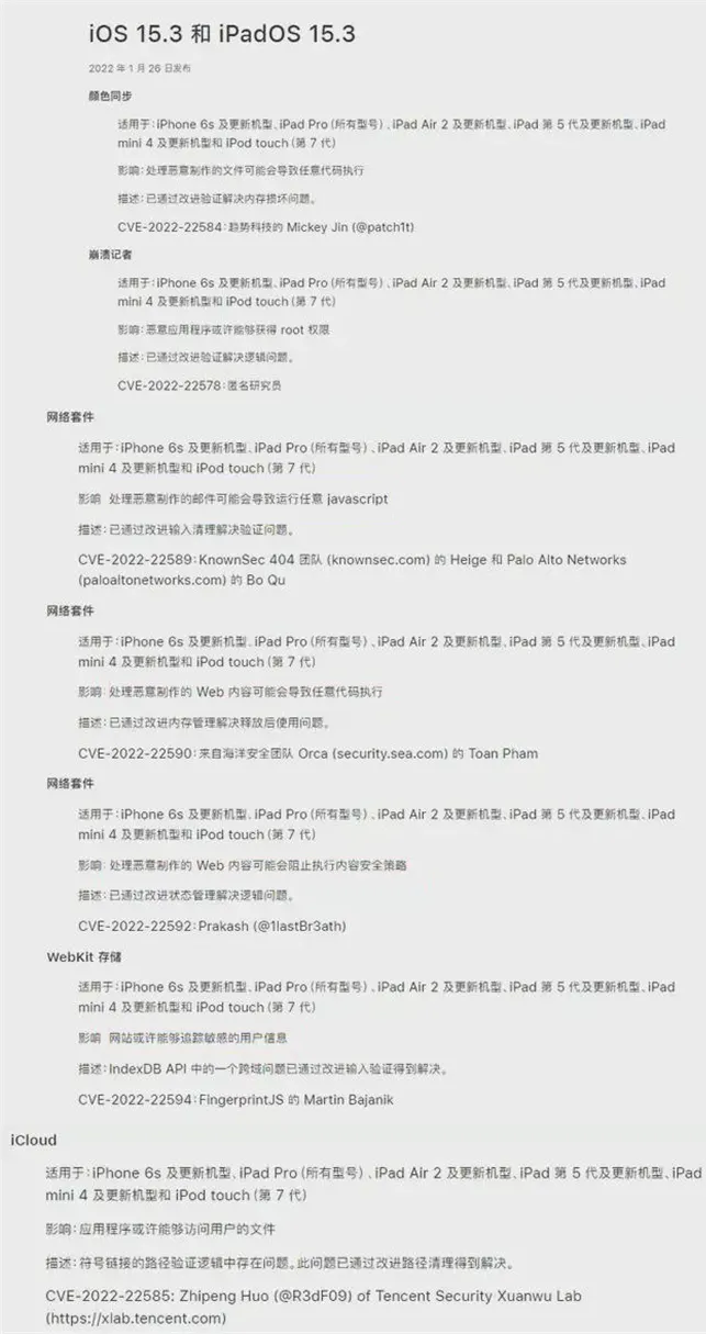 我们也扒了iOS15.3的安全文档,安全文档中对本次更新内容的主要描述也都修复类安全性更新,详见下图: