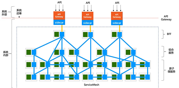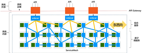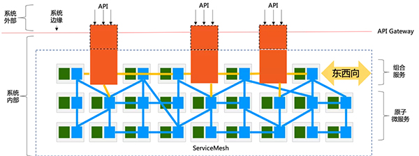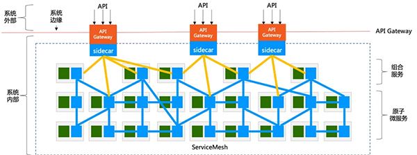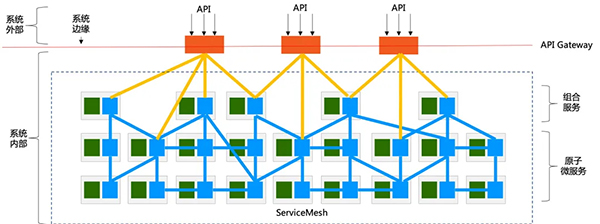 原子微服务和组合服务部署于 系统内部,在采用Service Mesh的情况下,由Service Mesh提供服务间通讯的能力