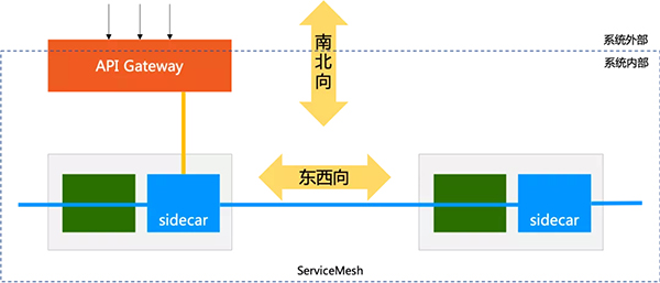 南北向通讯:指服务对外部提供访问,通常是通过API Gateway提供的API对外部暴露,其通讯流量是从系统外部进入系统内部。