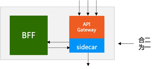 API Gateway和Sidecar融合之后,这就是一个“有API Gateway功能的大Sidecar”(或者是“有Sidecar功能的特殊API Gateway”):虽然扮演了API Gateway的角色,但本质上依然包含一个完整功能的sidecar,和BFF自带的Sidecar是等同的