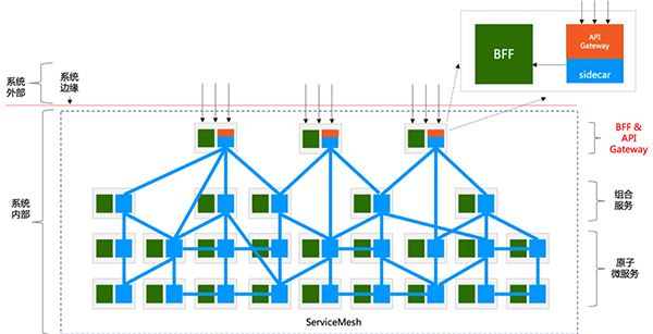 “BFF完全收口外部流量”,这一点在API Gateway和Sidecar融合之后,会变得很有想象空间,我们先看按照前面的融合方式,在有BFF的情况下,API Gateway和Sidecar融合后的情景: