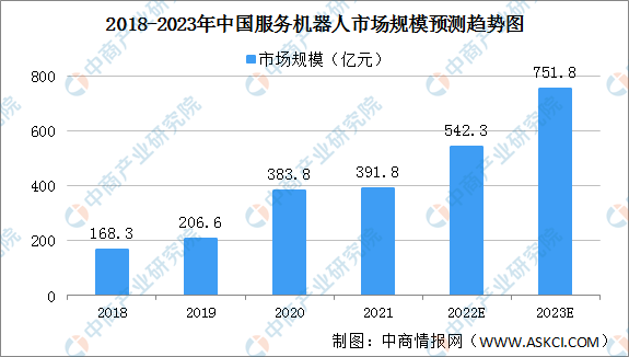 中国服务机器人市场已占全球市场1/4以上,近年来,中国服务机器人市场快速增长。据赛迪报告,2020年,受新冠肺炎疫情影响,中国服务机器人市场需求迎来爆发式增长,市场规模达到283.8亿元,同比增长37.4%。随着人口老龄化加剧,用工成本上涨,服务机器人需求潜力巨大,预计到2023年市场规模将达到751.8亿元。
