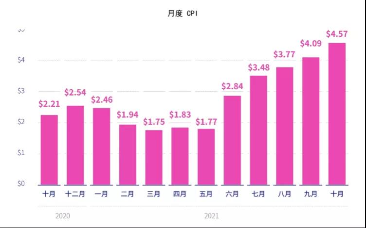 随着疫情的蔓延,在线交友约会已经成为日益被接受的正常现象,而且大受欢迎。随着用户逐渐适应这种新常态,手机仍将是交友约会的主要载体。从 2020 年到 2021 年,单次安装成本(CPI)同比增长了一倍多,从 2.21 美元增至 4.57 美元。受新冠肺炎变异病毒的影响,用户约会交友的方式转向线上,从 2021 年第二季度末到第四季度初,CPI 每月保持 12.8% 的稳定增长。