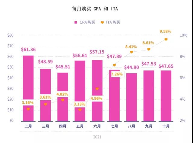 尽管约会交友移动应用的购买率在 2021 年 5 月降至年度最低,只有 3.13%,但对单身人士来说,活力满满的夏季又重新吸引了已接种疫苗、期待交友的约会应用用户,截至 2021 年 10 月,应用的购买率已稳步上升至 9.58%。