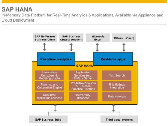 SAP HANA数据库适用于任何数据类型的事务和分析工作负载,使用单一数据副本。 它打破了组织中的事务和分析孤岛,以便组织快速做出决策,一方面归因于它能够整合来自组织内多个方面的数据,比如移动信息、传统业务文档和来自传感器的物联网数据。