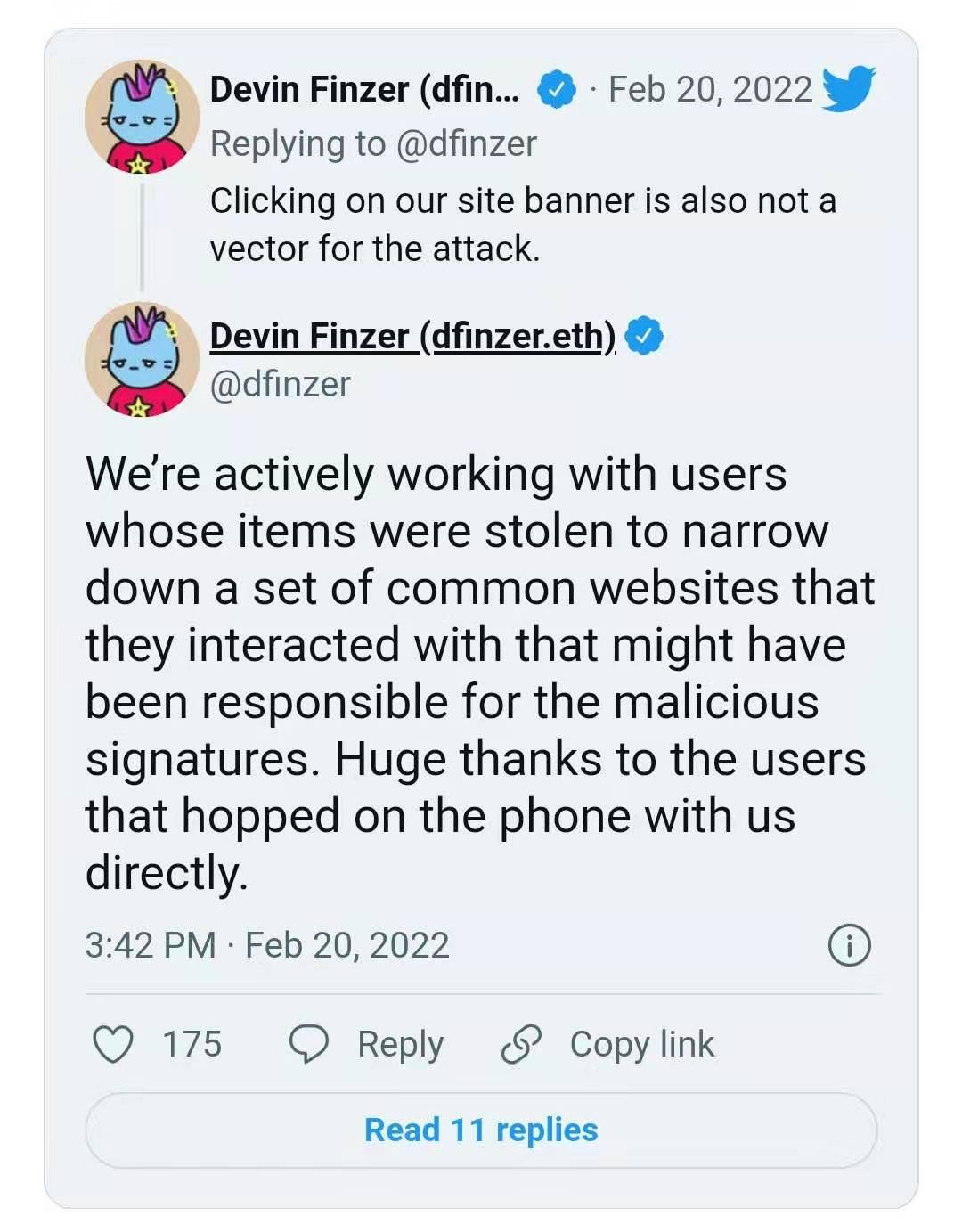 “我检查了每笔交易,”一位名叫 Neso 的用户说。“他们都有丢失 NFT 的有效签名,因此,任何声称他们没有被网络钓鱼就丢失 NFT 的说法都是站不住脚的。”