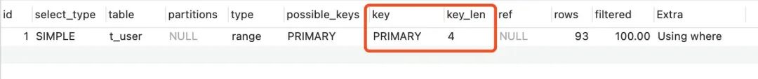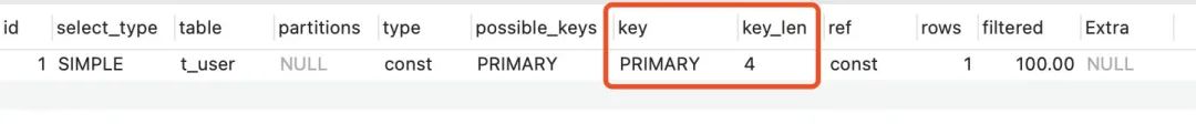 可以看到上述SQL语句使用了主键索引(PRIMARY),key_len为4;