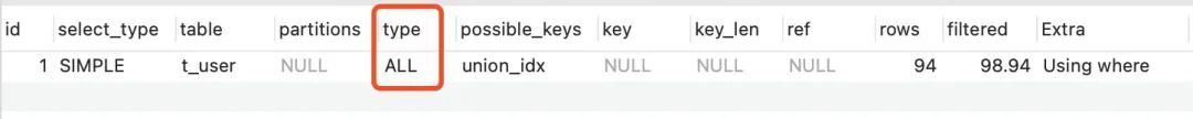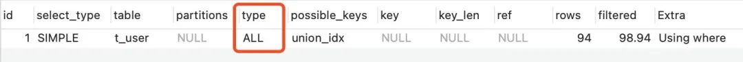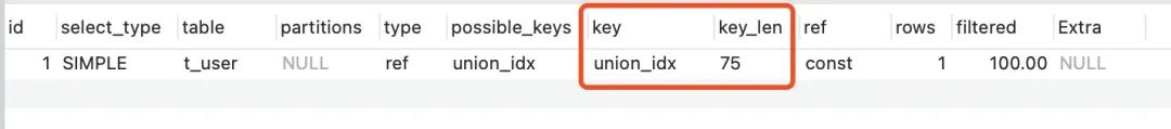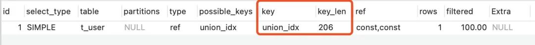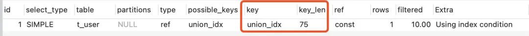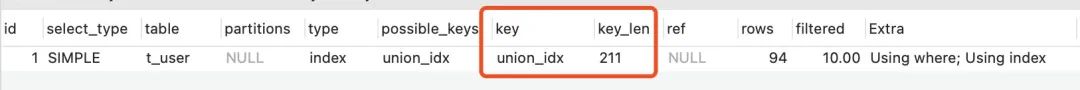 通过explain执行结果可以看出,上述SQL语句走了union_idx这条索引。