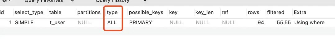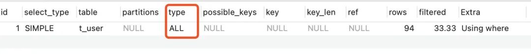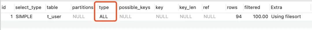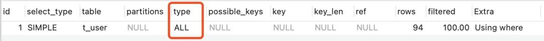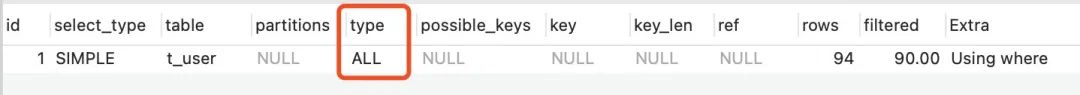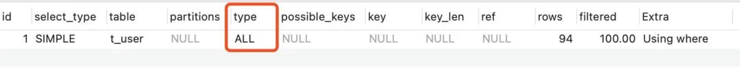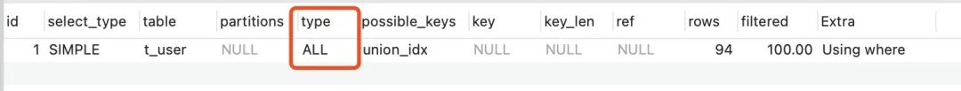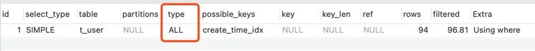 explain select * from t_user where create_time != '2022-02-27 09:56:42';1.