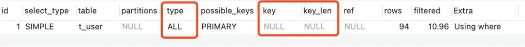 此时,可以看到未走任何索引,也就是说索引失效了。