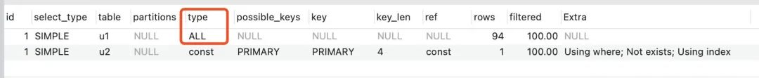 explain select * from t_user u1 where not exists (select 1 from t_user u2 where u2.id = 2 and u2.id = u1.id);1.