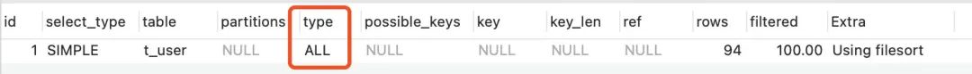 explain select * from t_user where id_no not in('1002' , '1003');1.explain结果:
