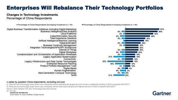 Gartner预计2022年全球企业的IT预算是从2008年以来最大的增幅,达到3.6%。中国IT预算达到4.9%,高于全球水平,但是十年来最低的一次。
