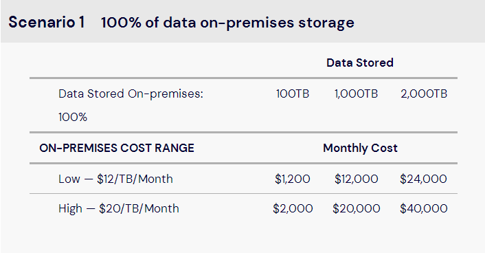 为了了解内部部署解决方案与使用私有云和公共云存储混合的解决方案之间的存储成本差异,以下介绍两种方案。对于每个场景,将使用 100TB、1PB 和 2PB 的数据存储量。每个表都是相同的格式,所做的只是改变数据的分布方式:私有云(内部)或公共云(外部)。在这一示例中,使用的是 Backblaze B2 云存储。