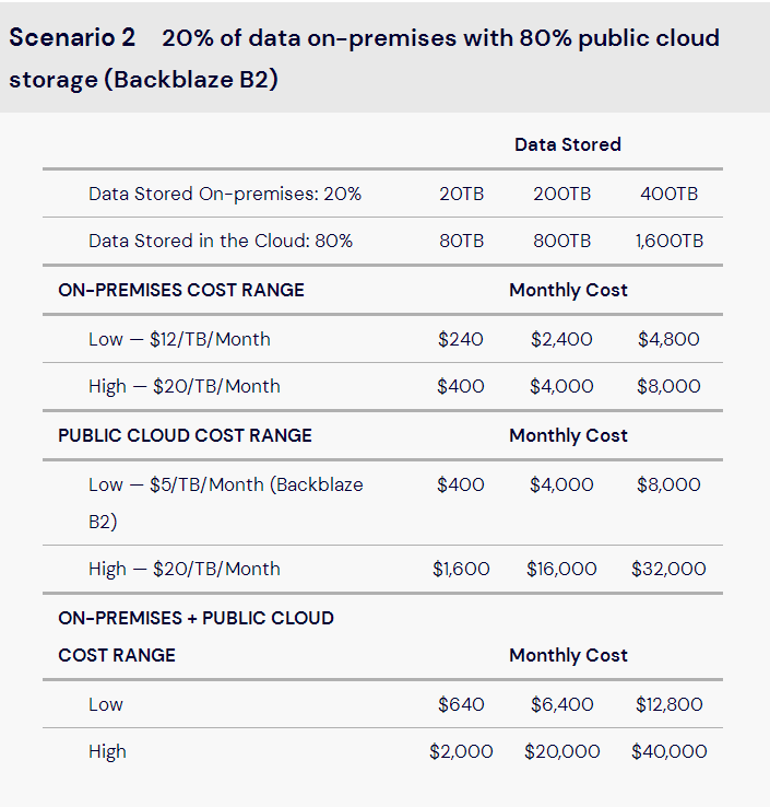 从上面的数字可以看出,使用混合云解决方案并通过 Backblaze B2 等提供商将 80% 的数据存储在云中,与仅在内部部署存储相比可以节省大量成本。