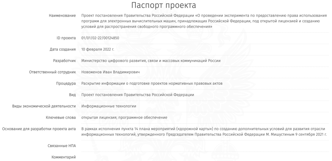 关于在开放许可下授予俄罗斯联邦拥有的电子计算机软件使用权并为自由软件的分发创造条件的实验。