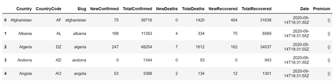 # showing the first 5 rows of the dataframe countries_df.head()1.2.3.4.5.以下是 countries_df.head() 的输出,我们可以使用它查看数据框的前 5 行: