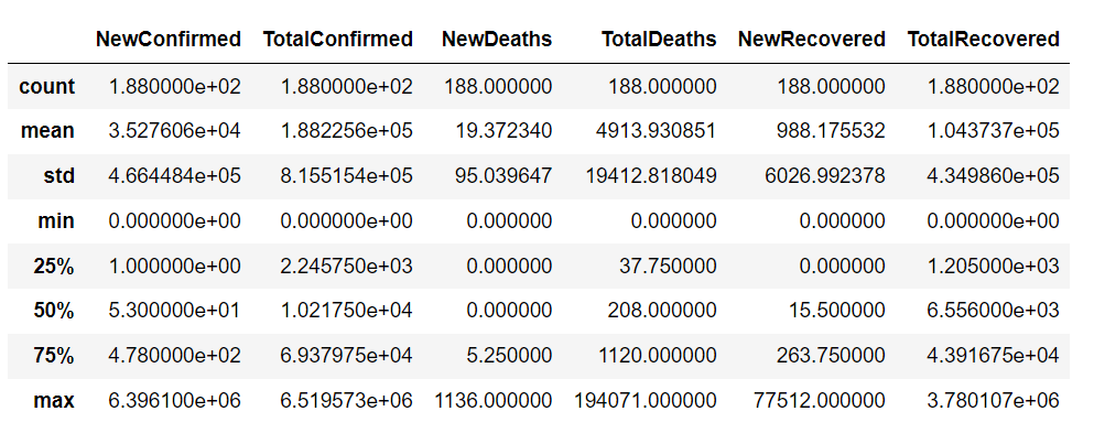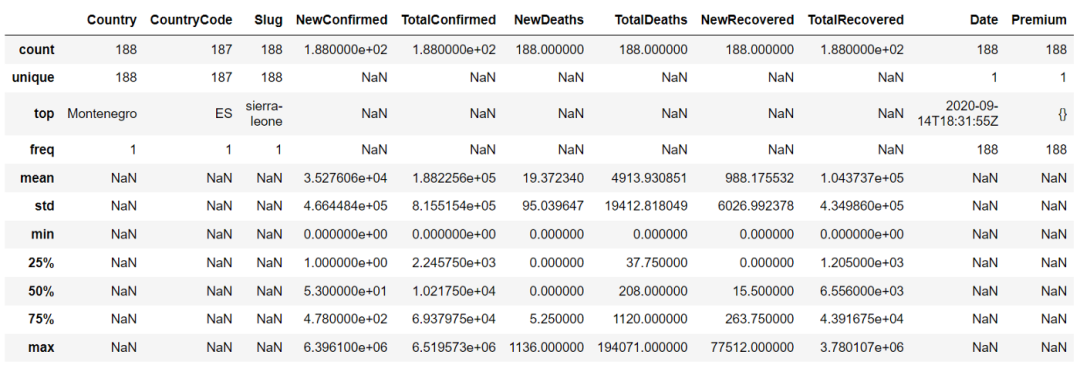 下一步就是通过查看数据汇总来了解数据,例如 NewConfirmed、TotalConfirmed 等数字列的计数、均值、标准偏差、分位数以及国家代码等分类列的频率、最高出现值