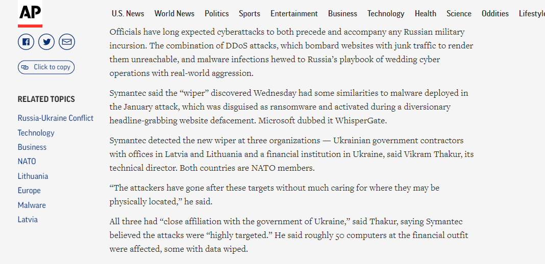 网络安全公司赛门铁克研究员表示,在2月23日的攻击中,针对乌克兰的攻击使用了一种新型的擦除数据的恶意软件,该恶意软件也在拉脱维亚和立陶宛活跃,这可能表明有意或无意的区域传播。